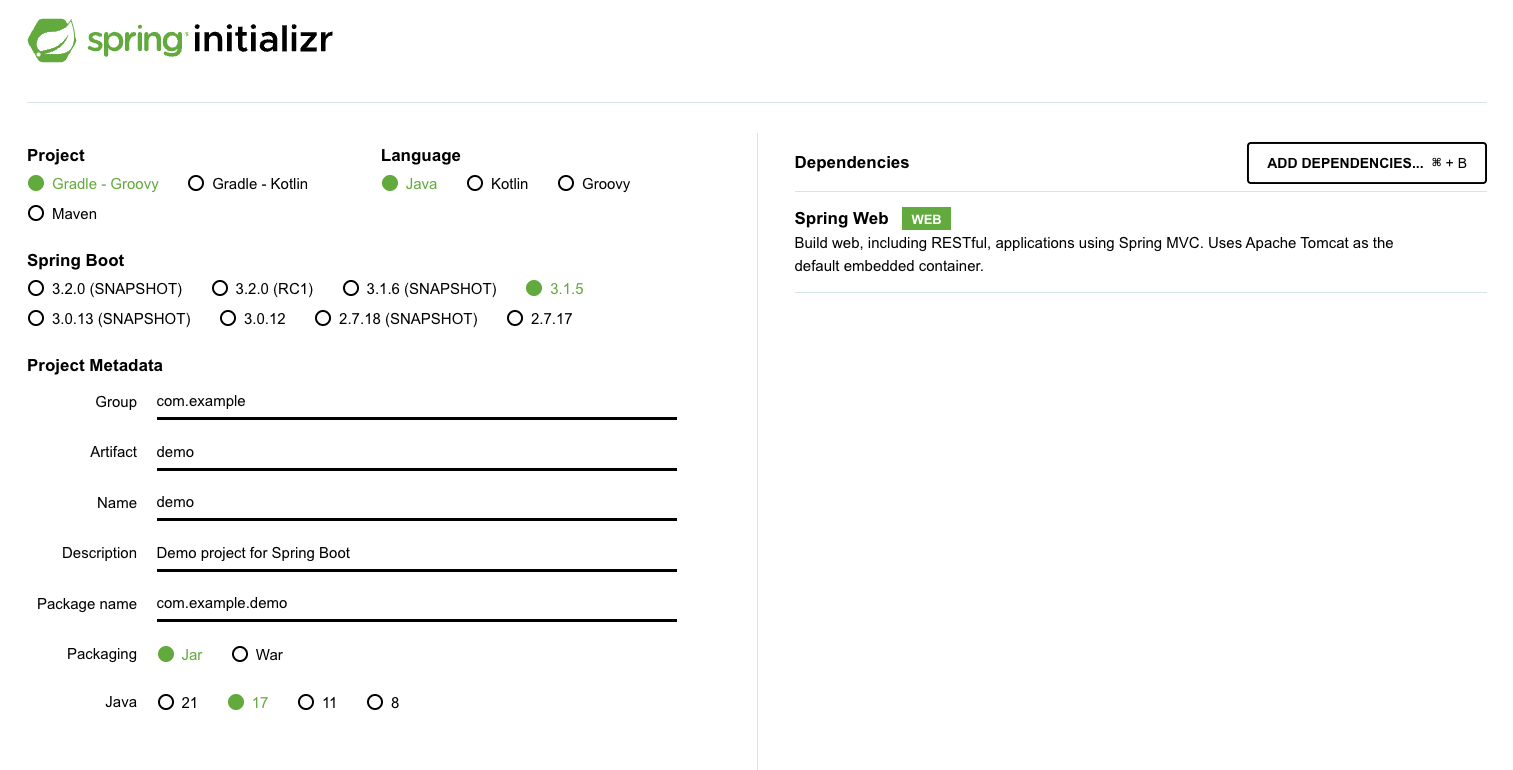 1. spring initializr에 접속 후 원하는 스펙을 선택 후 프로젝트 파일 다운로드