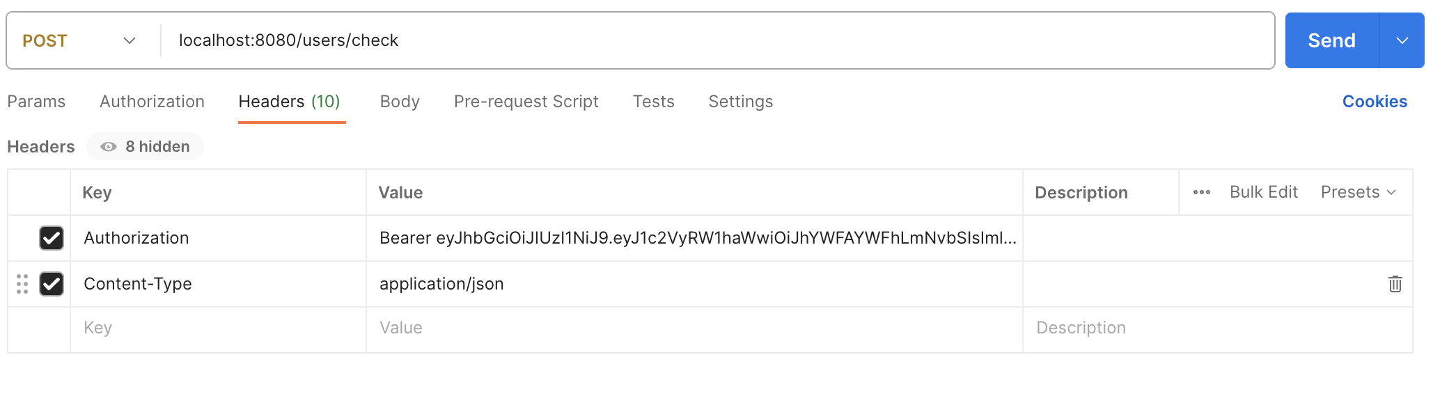 토큰을 Header에 넣어 전송할 때에는 토큰 앞에 `Bearer` 이라는 문자열을 추가하여 전송한다.