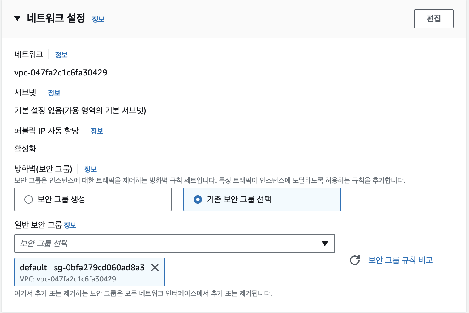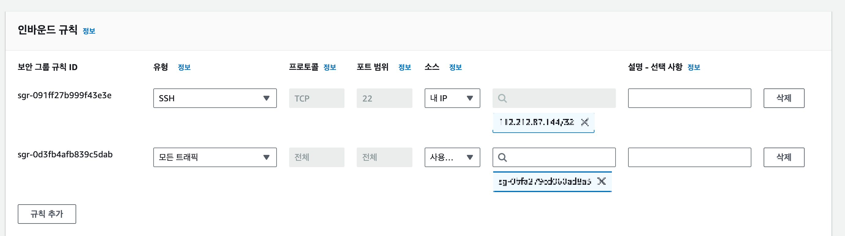 저는 기존 보안 그룹을 선택하였는데 인스턴스 접속 시 에러가 발생하여 수정 작업을 진행했습니다🥲
