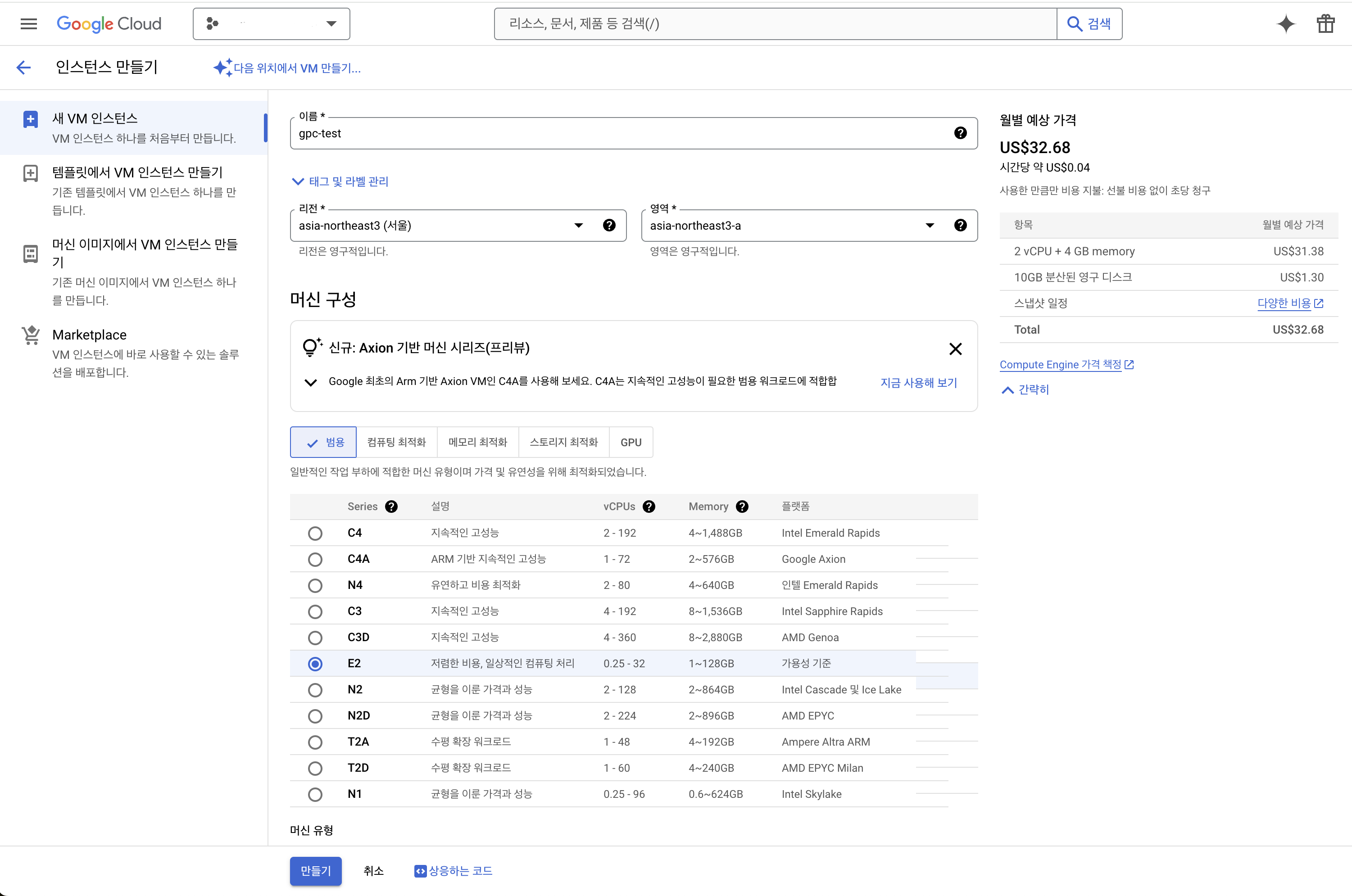 | N2 | 중간 성능을 제공하는 범용 머신 유형 | 웹 서버 및 애플리케이션 서버에 적합 |