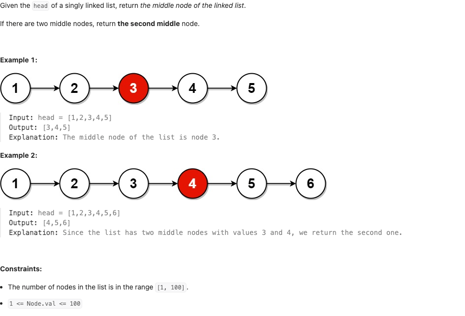 - 짝수 개의 노드가 있다면, 두 개의 중간 노드 중 두 번째를 반환한다.