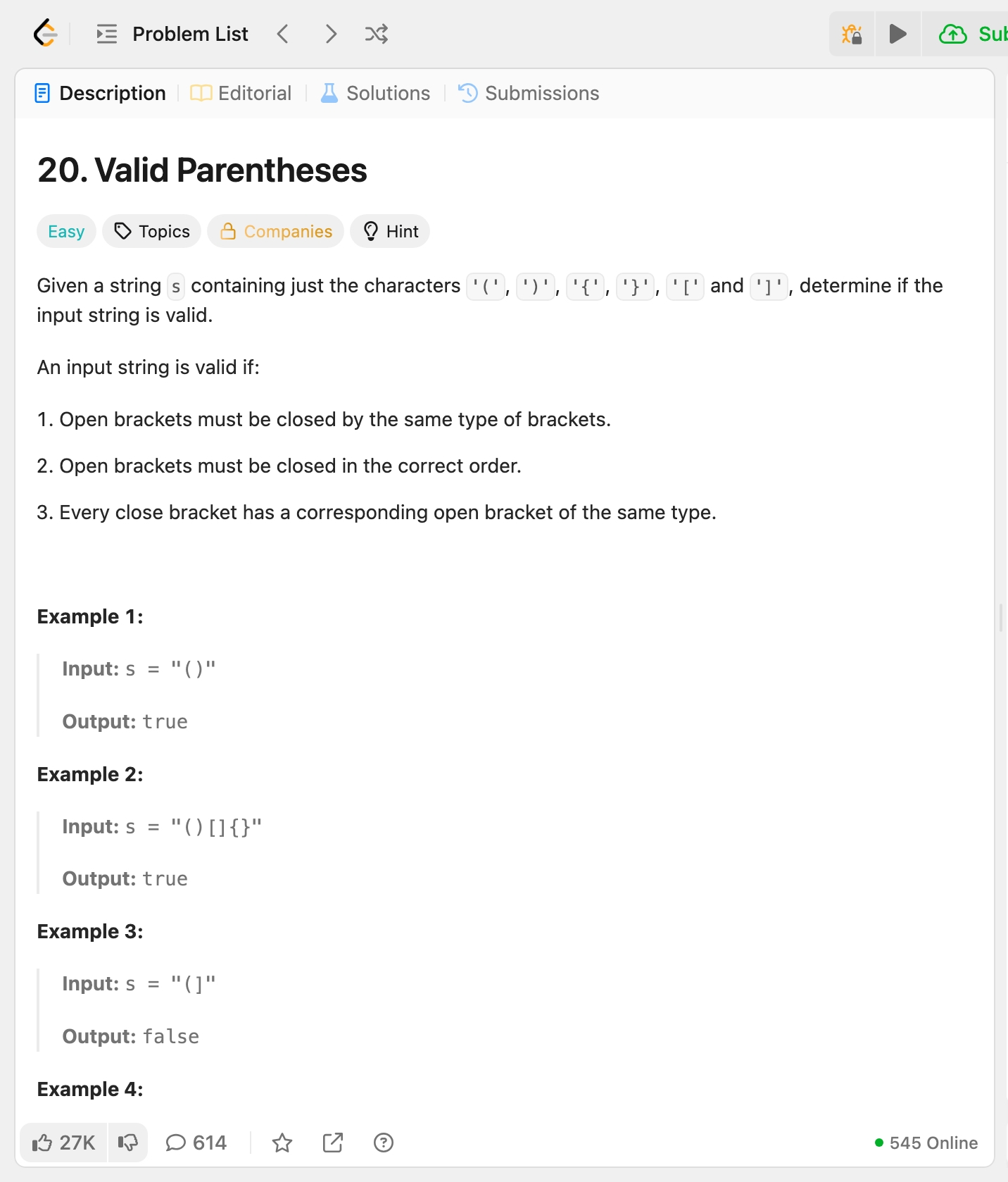 이때, 문자열이 **올바른 괄호 문자열(valid parentheses)**인지 판별하세요.