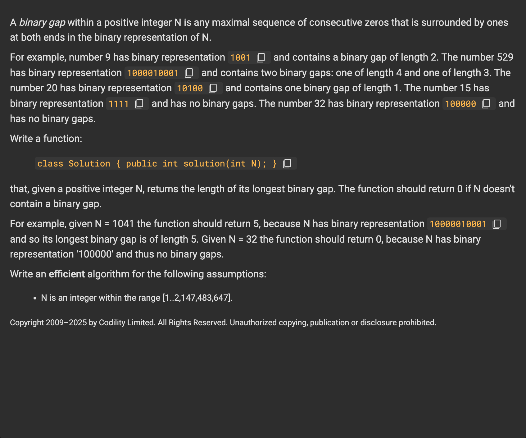 Binary gap은 어떤 양의 정수 N을 2진수로 표현했을 때, 양쪽이 1로 둘러싸인 연속된 0들의 구간 중 “최대 길이”를 의미한다.