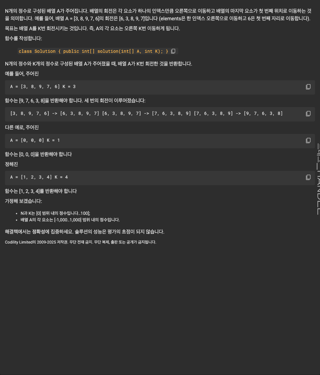 - 배열을 오른쪽으로 K번 회전시키는 문제로 “단순히 K번 반복해서 배열을 밀어내는 방식”은 비효율적!