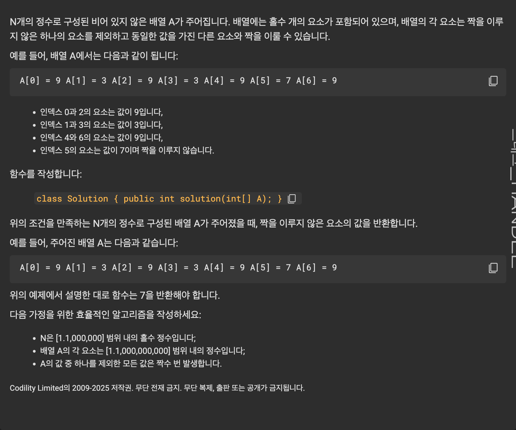 // 문제 조건상 짝이 없는 원소는 정확히 하나 존재